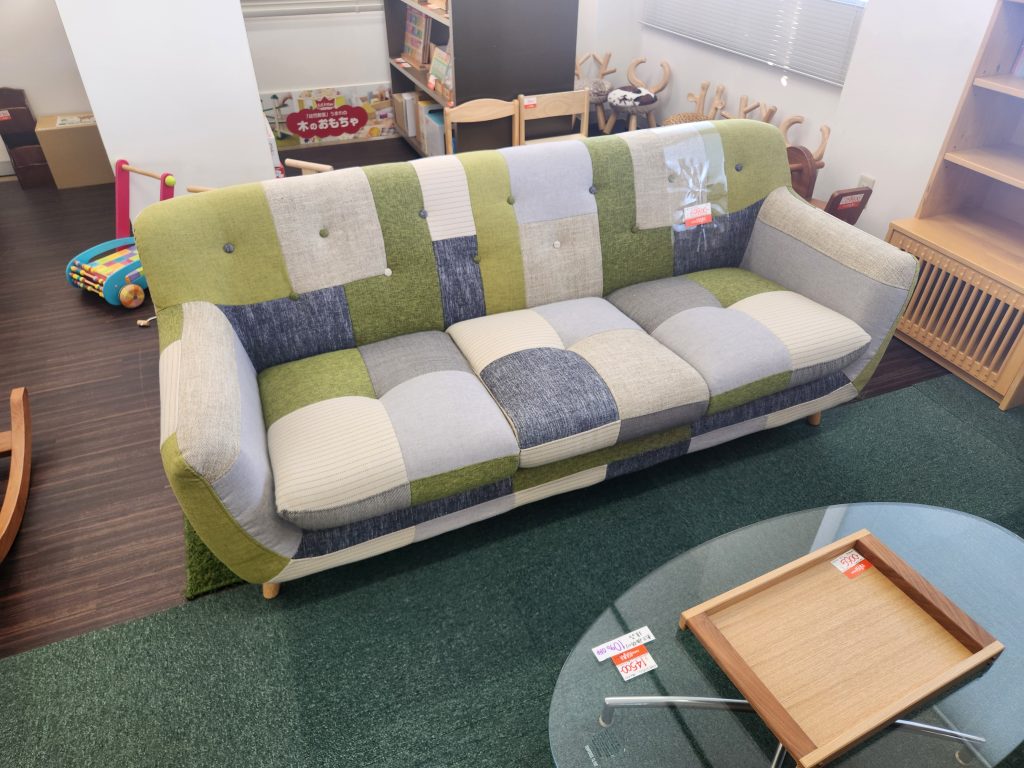 パッチワークが可愛らしい3人掛けソファ。お部屋の主役に。